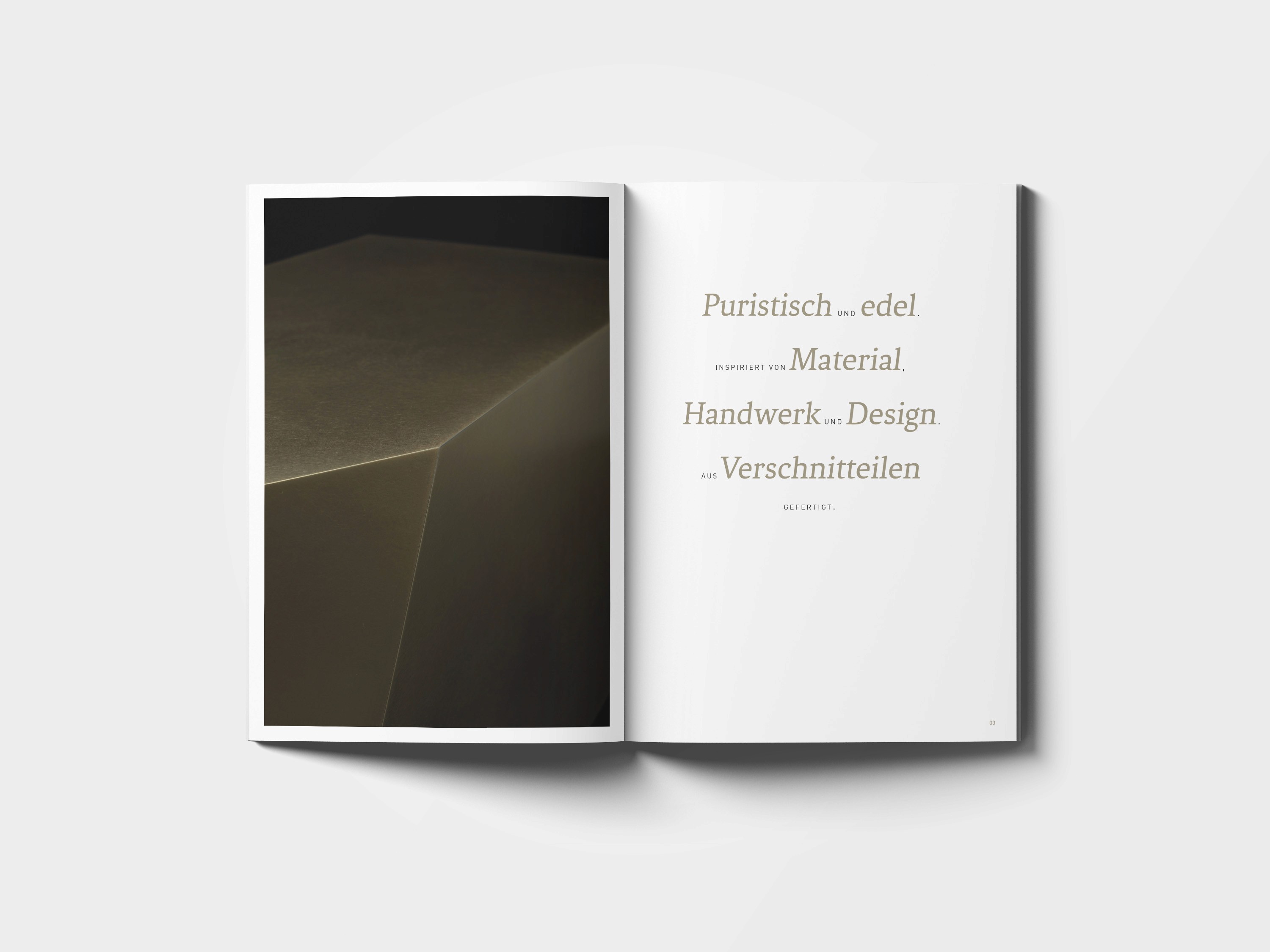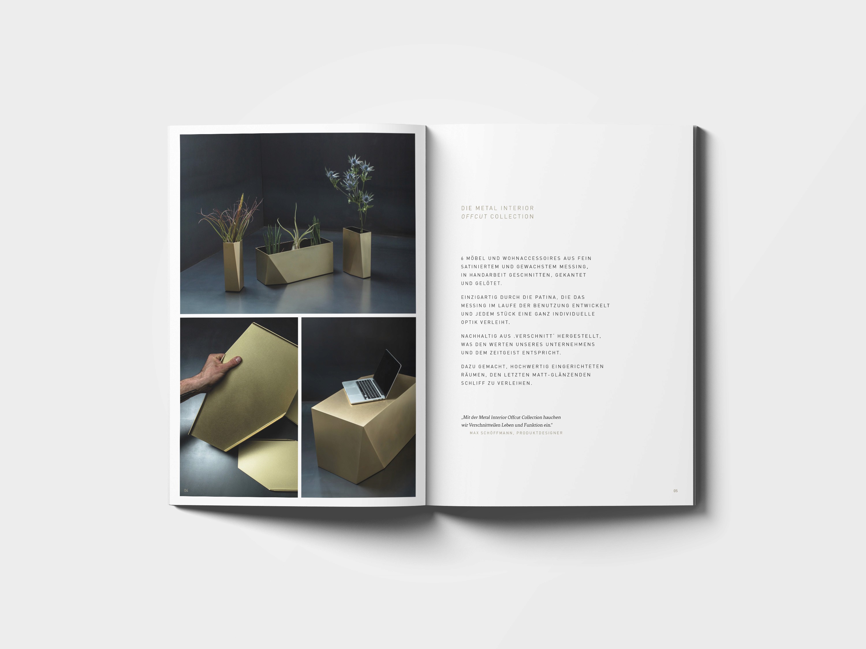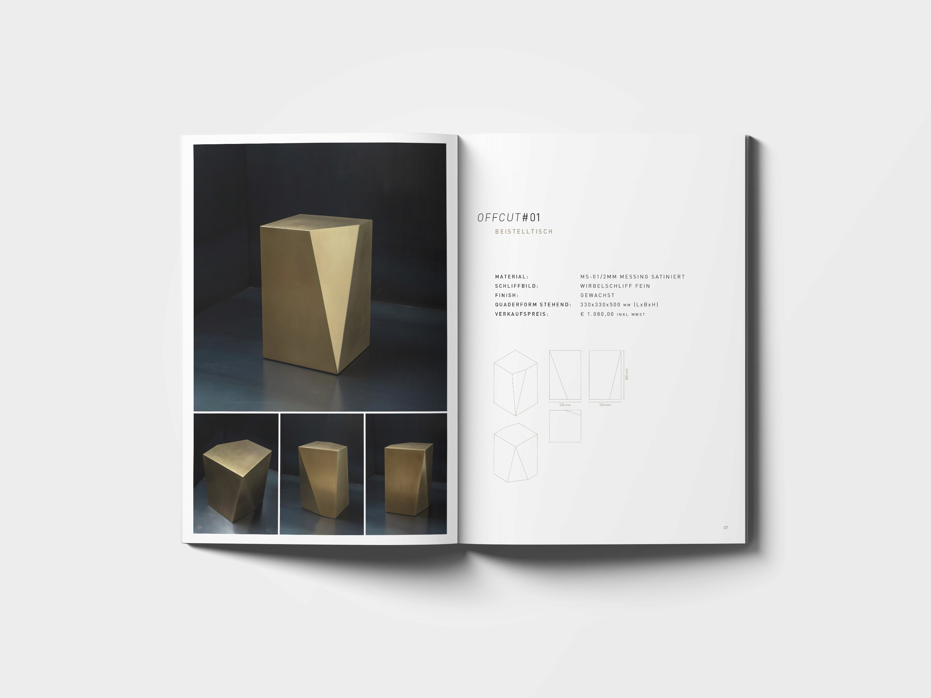Die Kollektion 'cut off' besteht aus 6 handgefertigten Möbelstücken und Wohnaccessoires aus satiniertem und gewachstem Messing. Jedes Stück ist durch natürliche Patina und den nachhaltigen Einsatz von Materialverschnitt einzigartig. BUERO.R gestaltete den Katalog zur Präsentation dieser besonderen Kollektion und setzte die Produkte mit stilvollem Design und klarer visueller Sprache in Szene.