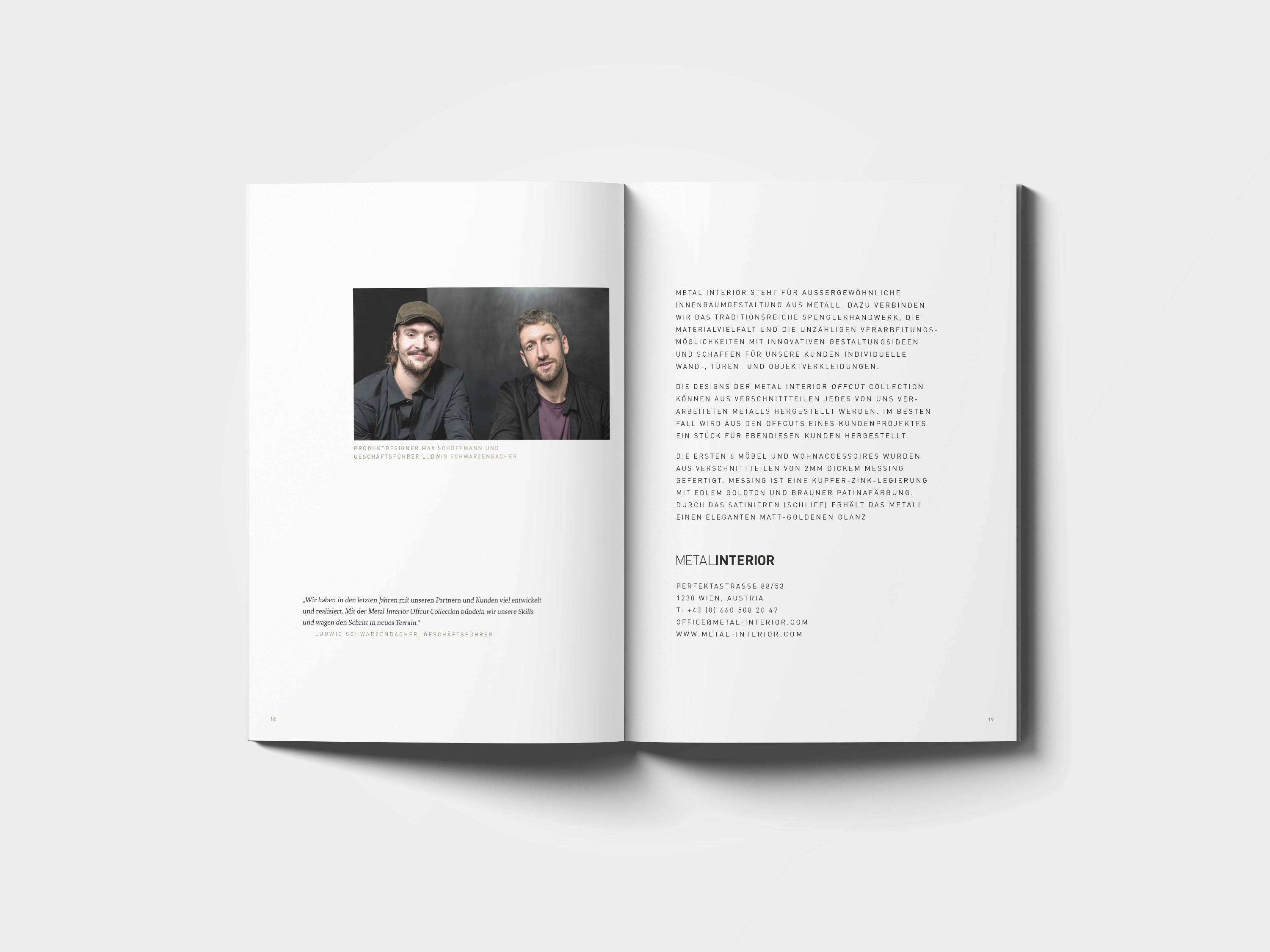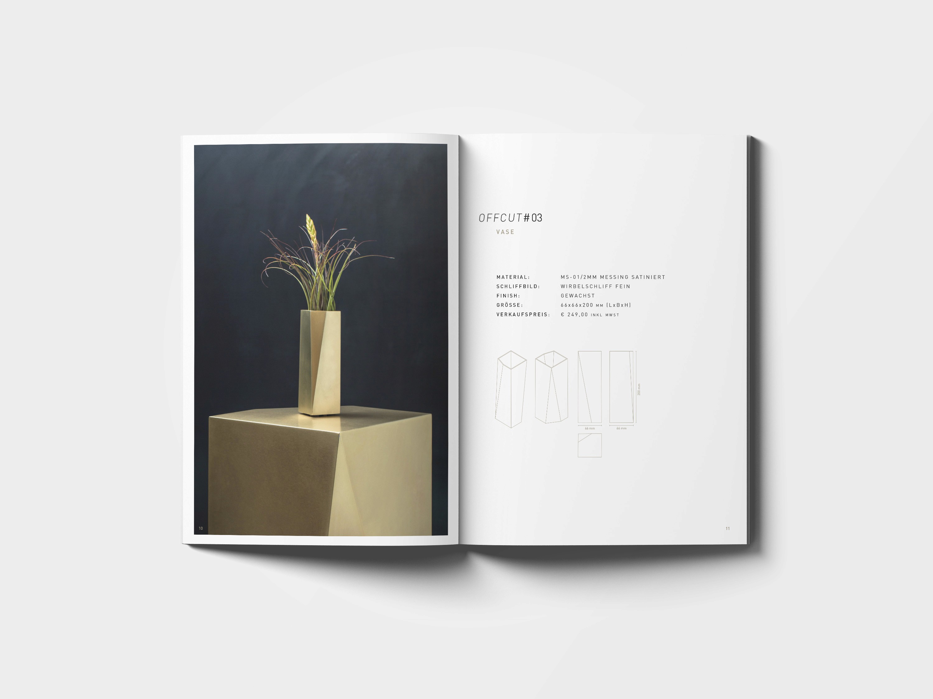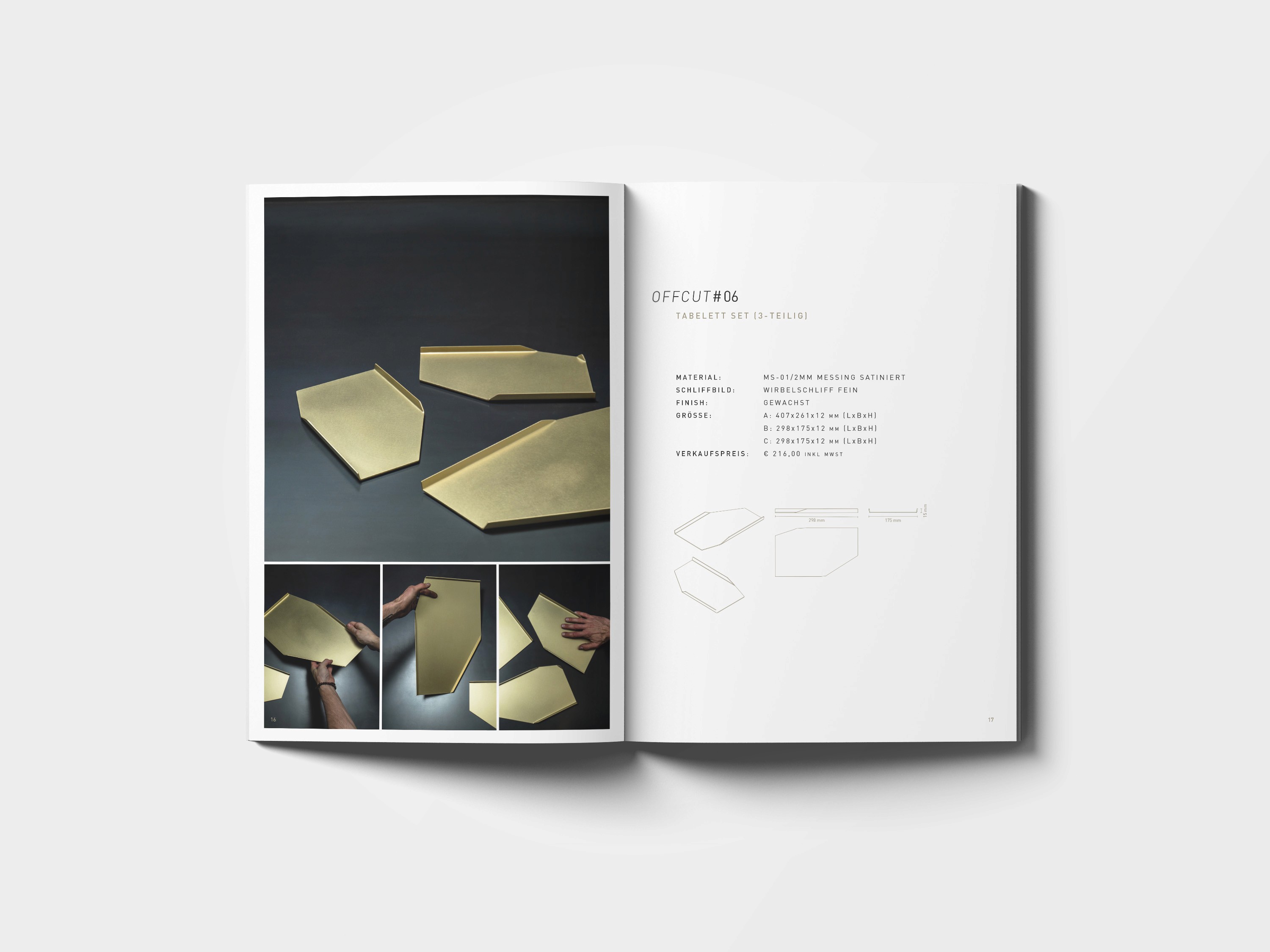 Die Kollektion 'cut off' besteht aus 6 handgefertigten Möbelstücken und Wohnaccessoires aus satiniertem und gewachstem Messing. Jedes Stück ist durch natürliche Patina und den nachhaltigen Einsatz von Materialverschnitt einzigartig. BUERO.R gestaltete den Katalog zur Präsentation dieser besonderen Kollektion und setzte die Produkte mit stilvollem Design und klarer visueller Sprache in Szene.
