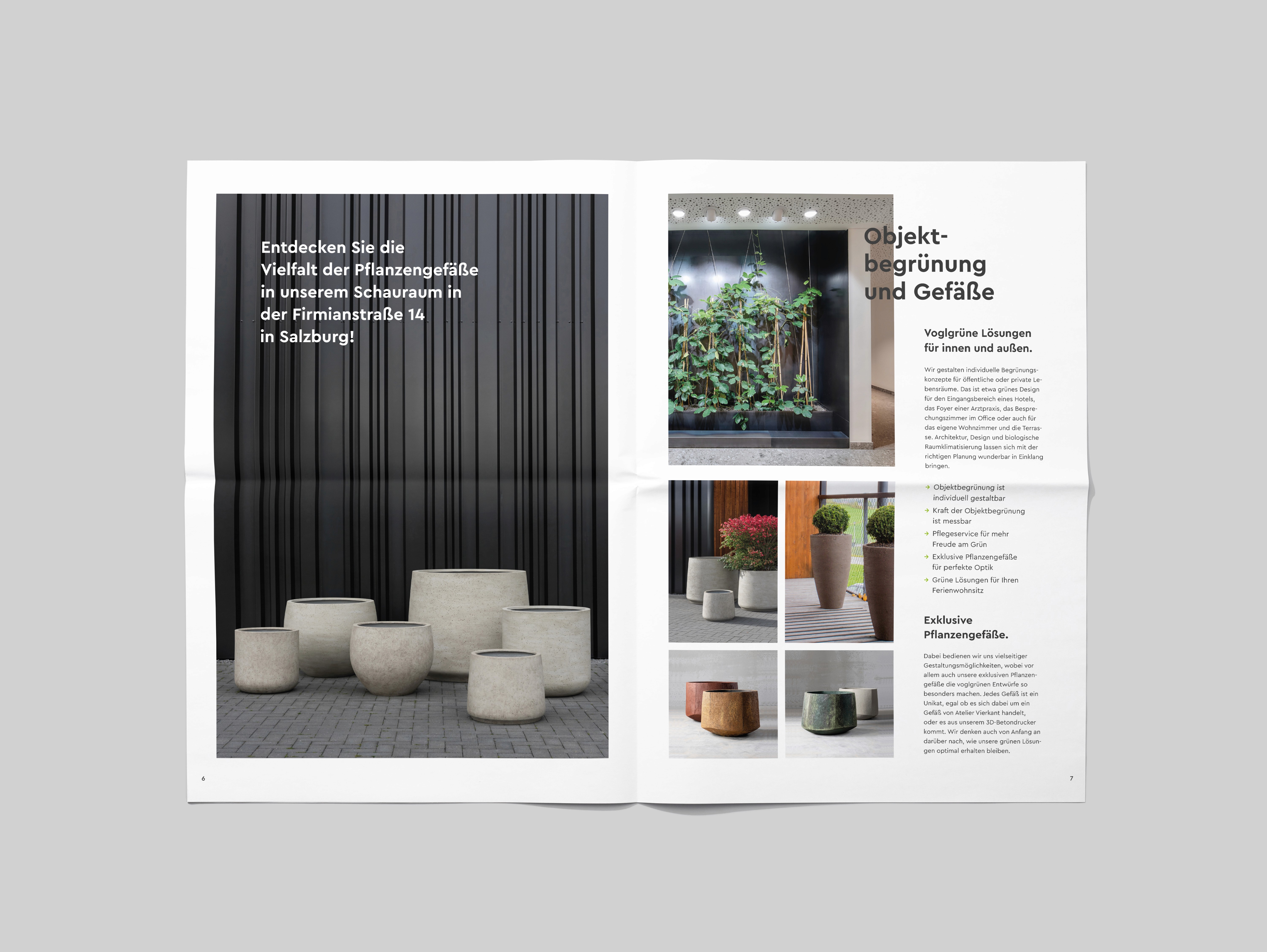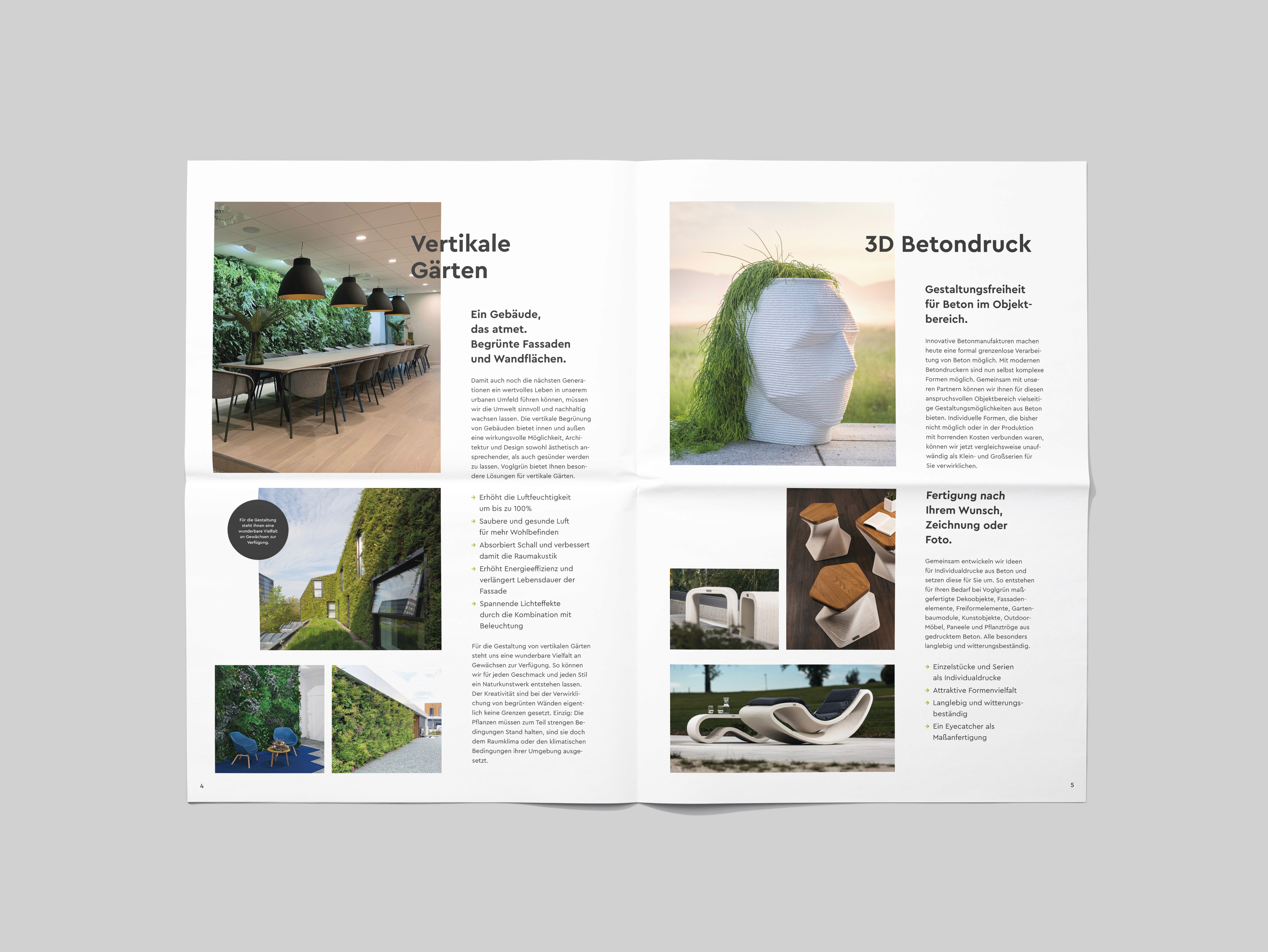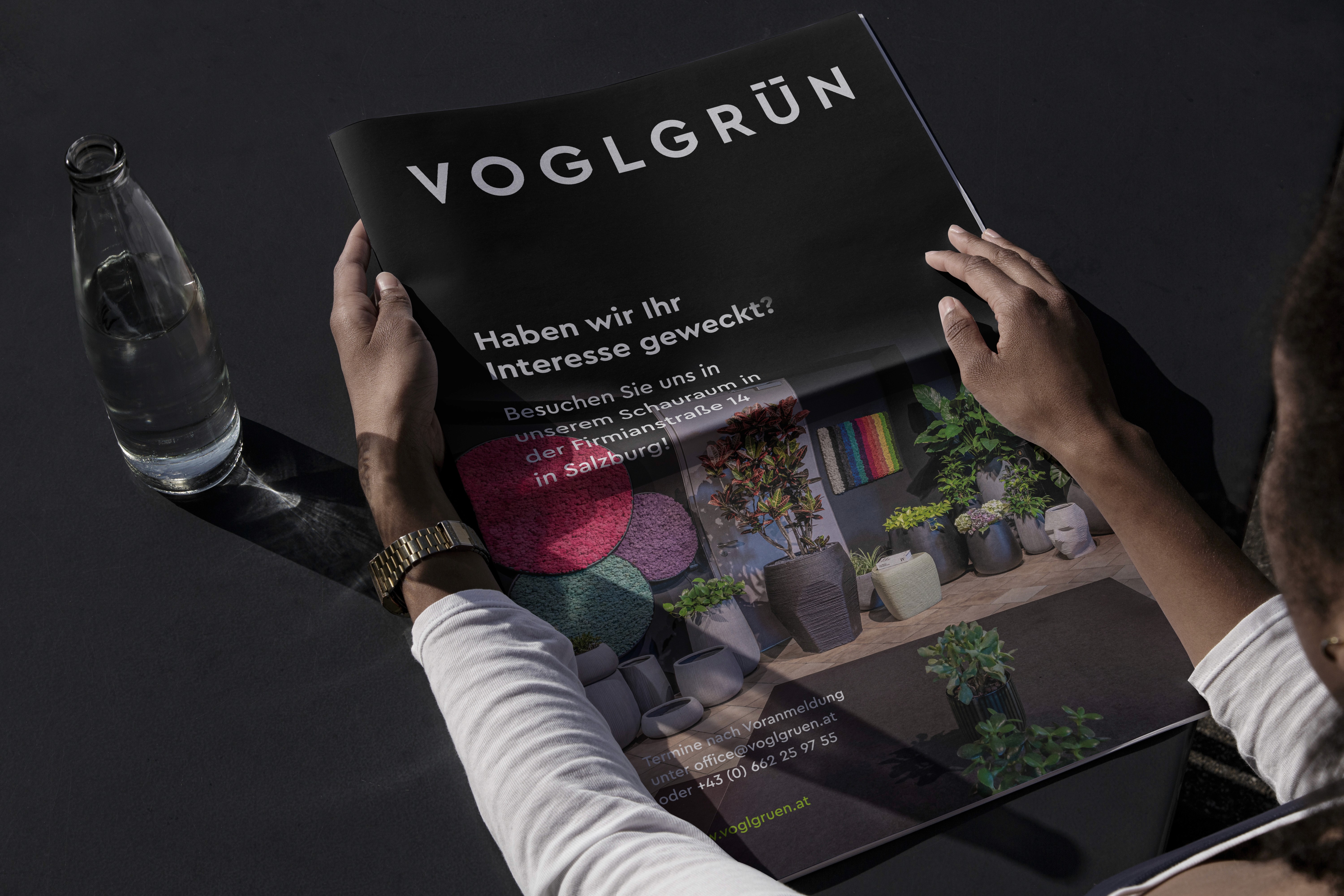 Innen- und Außenbereich. BUERO.R entwickelte das Brand Design von Voglgrün sowie eine Zeitung als Imagefolder und den zentralen Webauftritt.