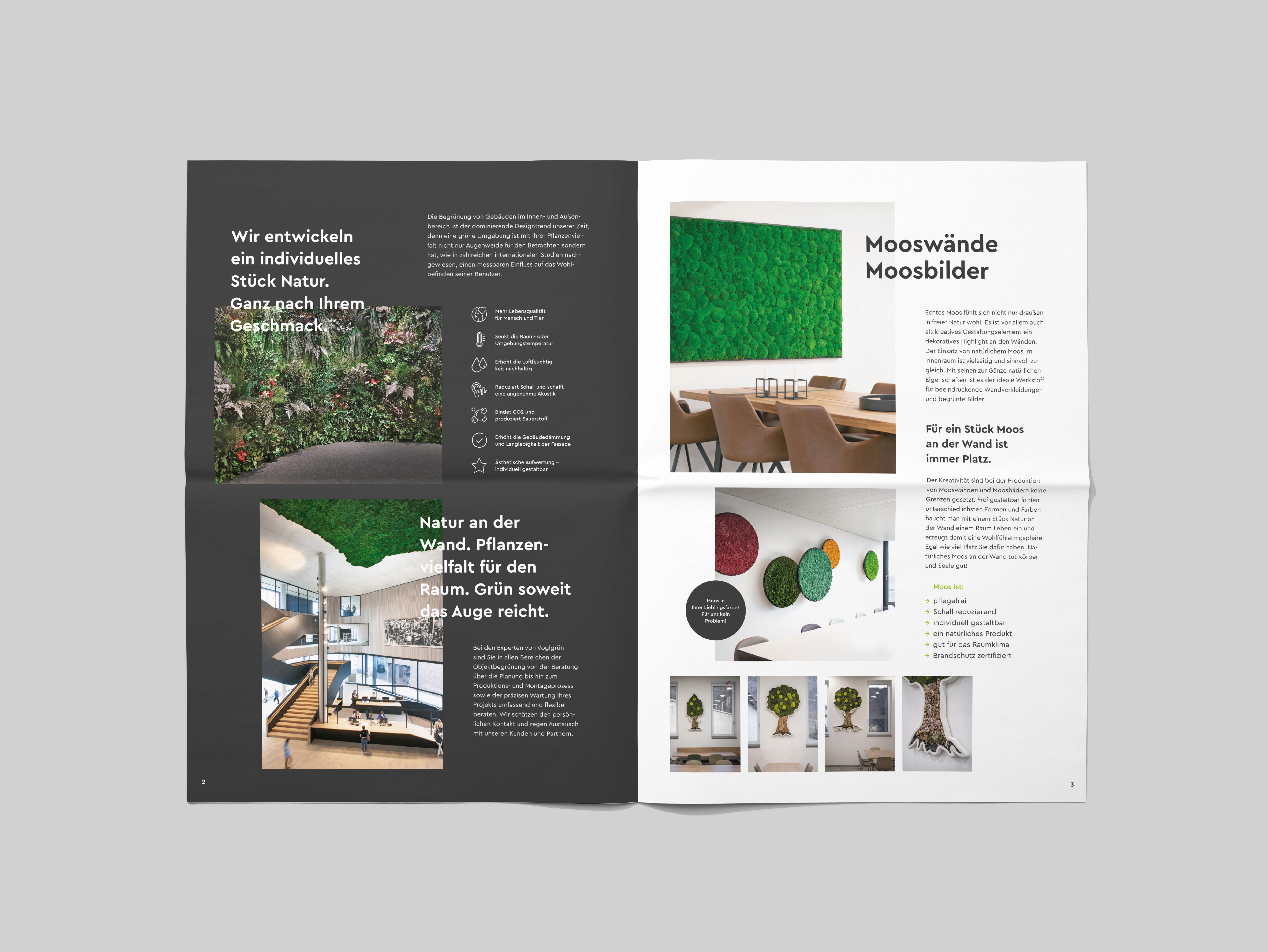 Grüne Fassaden, Wand- und Raumgestaltungen für mehr Qualität und Nachhaltigkeit im Leben: Voglgrün bietet maßgefertigte Begrünungen für Wohnräume und Arbeitswelten im Innen- und Außenbereich. BUERO.R entwickelte das Brand Design von Voglgrün sowie eine Zeitung als Imagefolder und den zentralen Webauftritt.